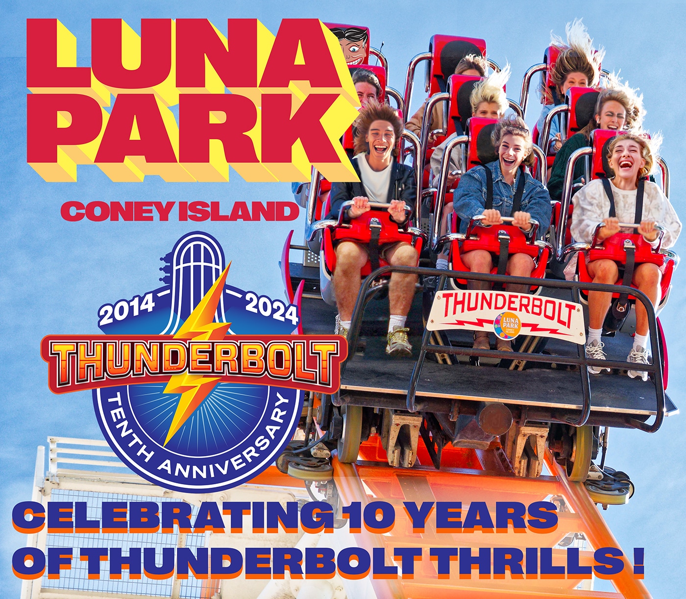 Luna Park in Coney Island, New York City’s destination for amusement and thrills, is preparing to celebrate 10 years of the iconic Thunderbolt roller coaster with the Thunderbolt 10th Anniversary Coasterthon. As the first-ever steel roller coaster in New York City, the Thunderbolt has been the ultimate attraction for high thrills at Luna Park since it was introduced in 2014. In celebration of this milestone, Luna Park will host a charity Coasterthon on Friday, June 14, 2024, from 11 AM to 1 PM. 10 non-profit organizations will ride all eight of Luna Park’s roller coasters, marathon-style, to raise funds and awareness for their respective missions.