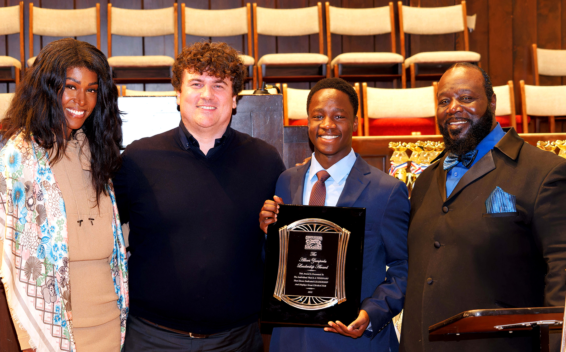 The Coney Island Sharks award ceremony featured speeches, recognition of players and staff, and the presentation of various awards, including championship trophies and special honoree awards. These awards included recognition for the founding members of the Coney Island Sharks and a new award named after the late amusement park icon, Alberto Zamperla, for his Leadership and contributions to the Coney Island community – the Alberto Zamperla Leadership Award. The leadership award was awarded to Charles Nzegerou, a Coney Island Sharks scholar that aspires to be an architect.