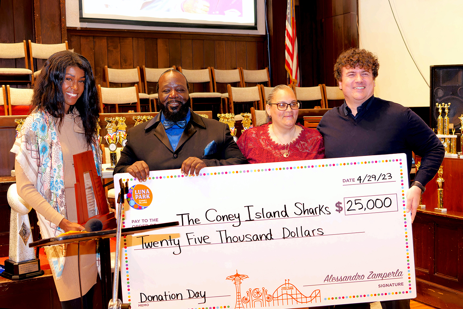 On Saturday, April 29, at 6:00 PM, Alessandro Zamperla, President and CEO of Central Amusement International Inc., presented a donation of $25,000 to the Coney Island Sharks during the organization’s annual awards ceremony at the Coney Island Gospel Assembly Church. The donation is a result of Luna Park’s annual charitable Donation Day tradition, where the park donates all their wristband proceeds to charitable organizations.