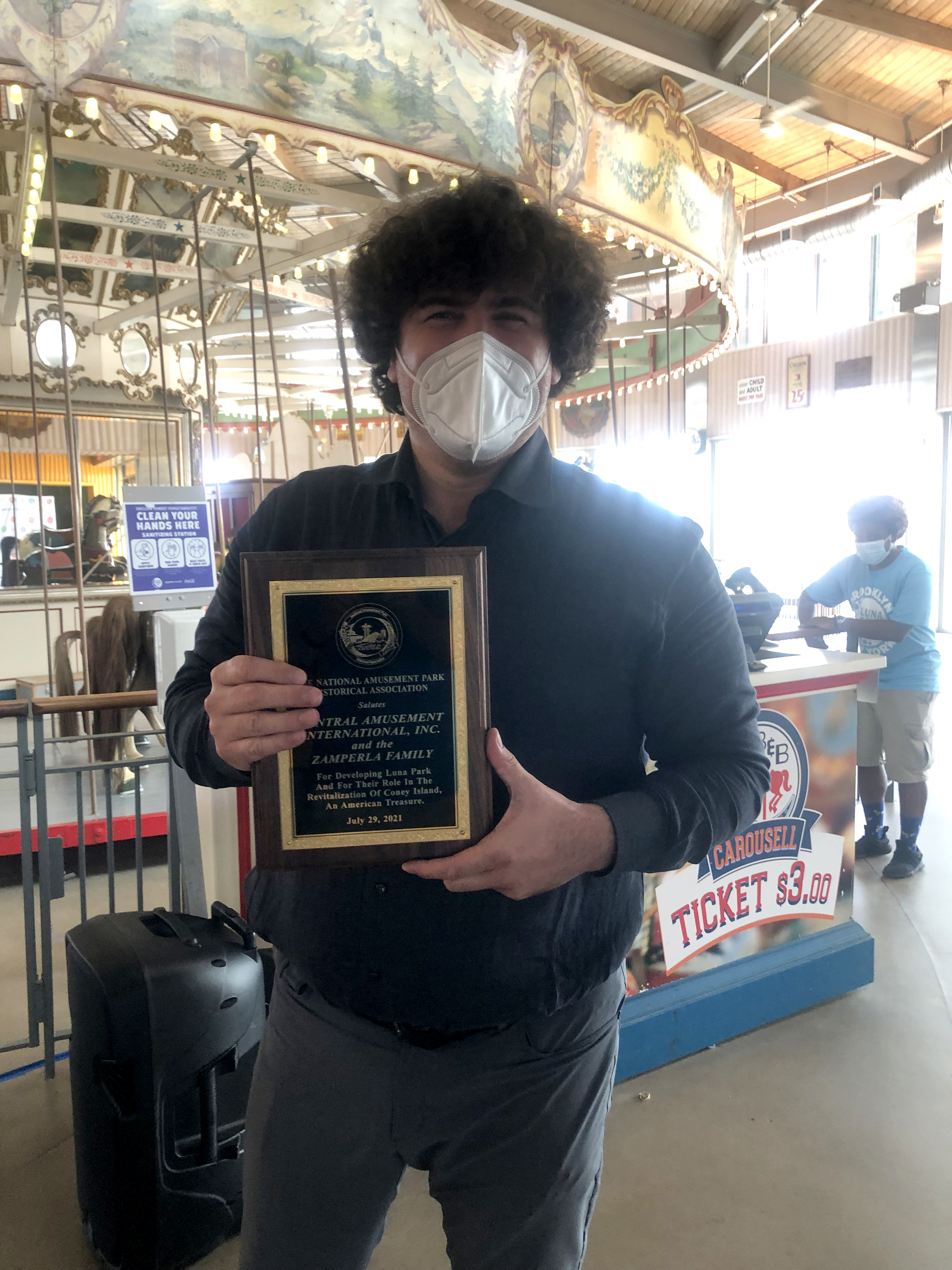 In a small ceremony, held at the historic 115-year-old B&B Carousell, NAPHA presented Central Amusement International Inc. (CAI), our parent company, and the Zamperla Family, with an award recognizing their incredible contributions in the revitalization of the historic Amusement District at Coney Island! The President and CEO of our parent company CAI, Alessandro Zamperla, accepted the award on behalf of the CAI team and his family.