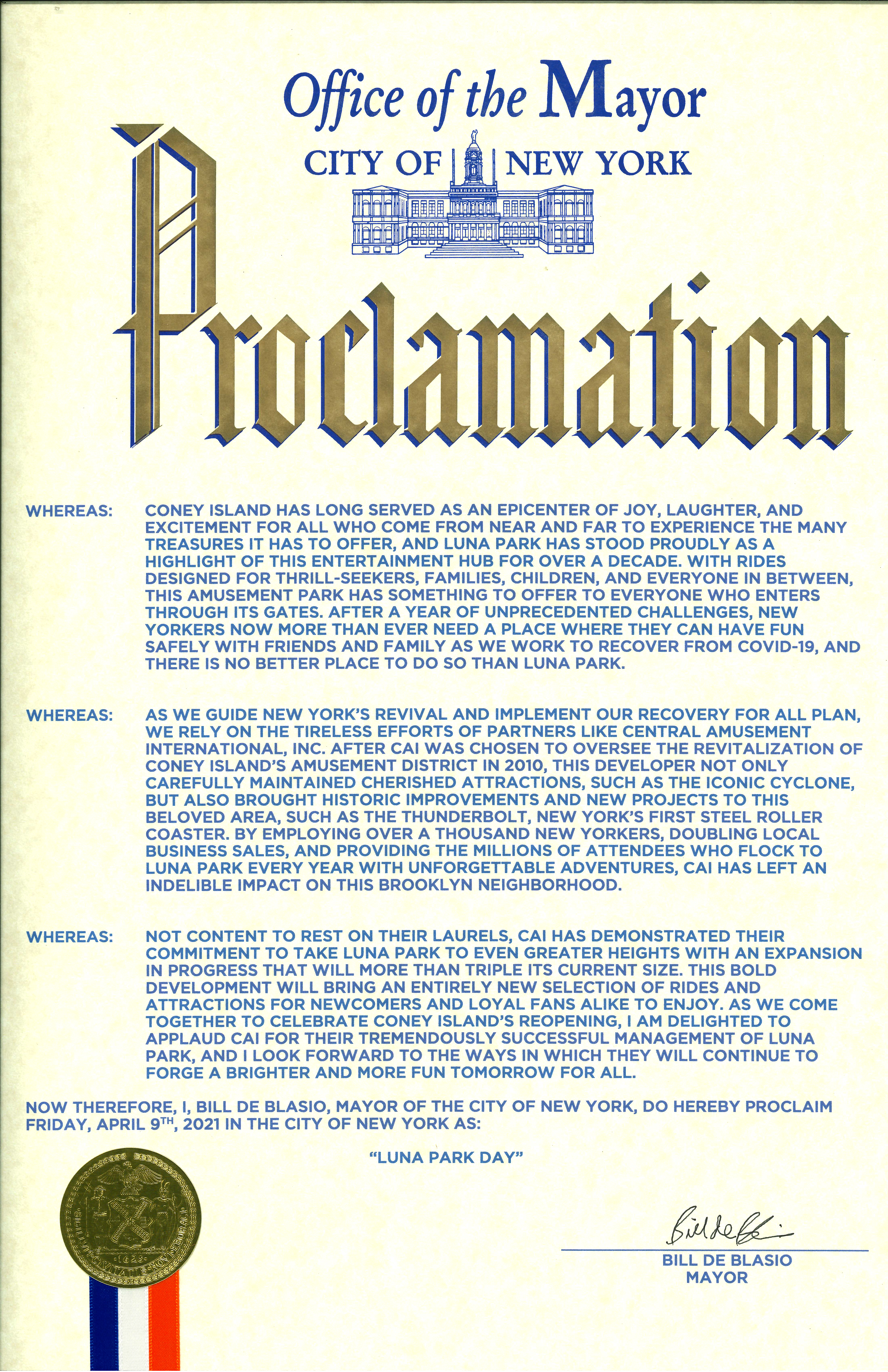 Central Amusement International receives a Proclamation from Mayor Bill de Blasio and the City of New York.