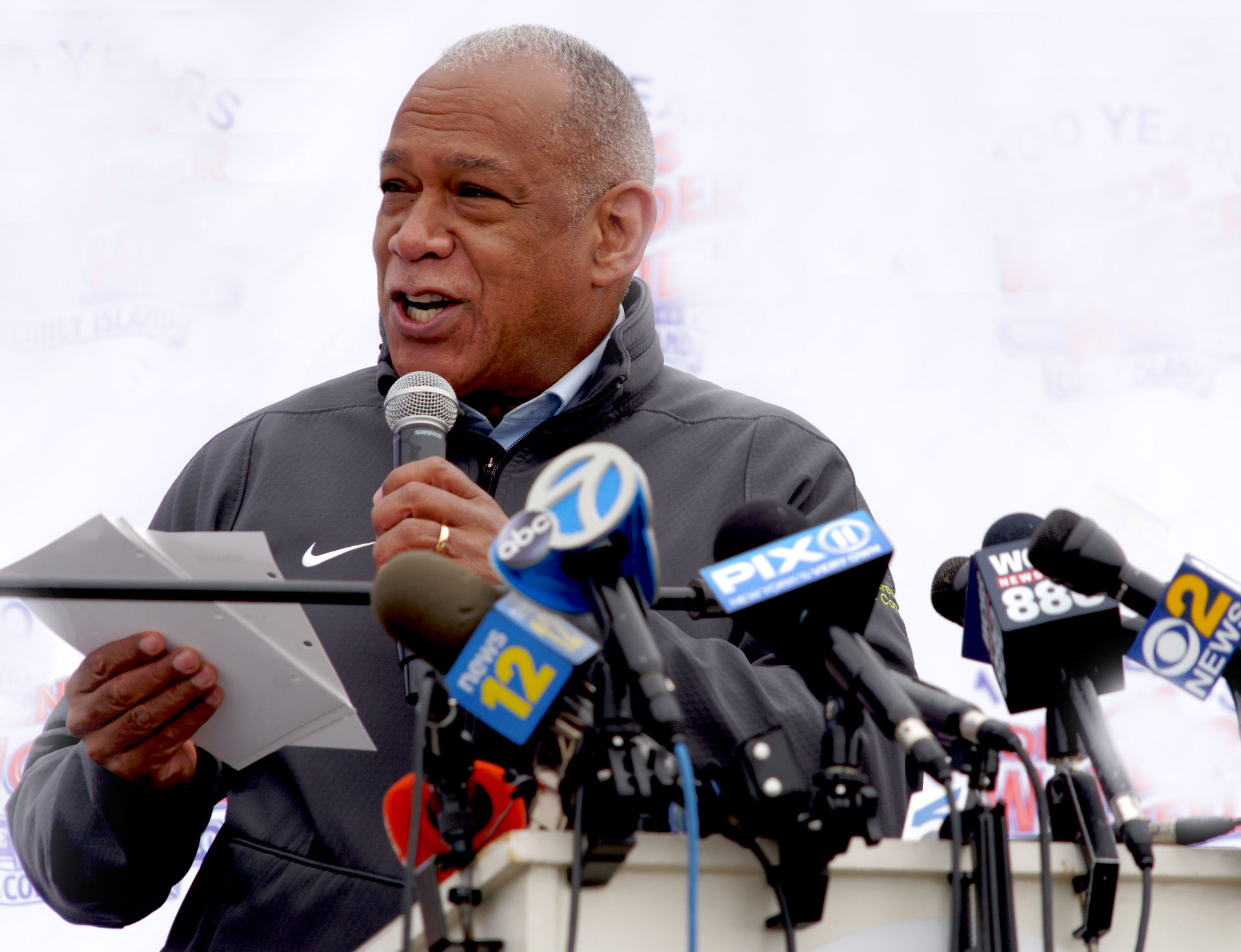 Department of Parks and Recreation Commissioner Mitchell Silver speaks at the opening ceremony before riding the Coney Island Cyclone.