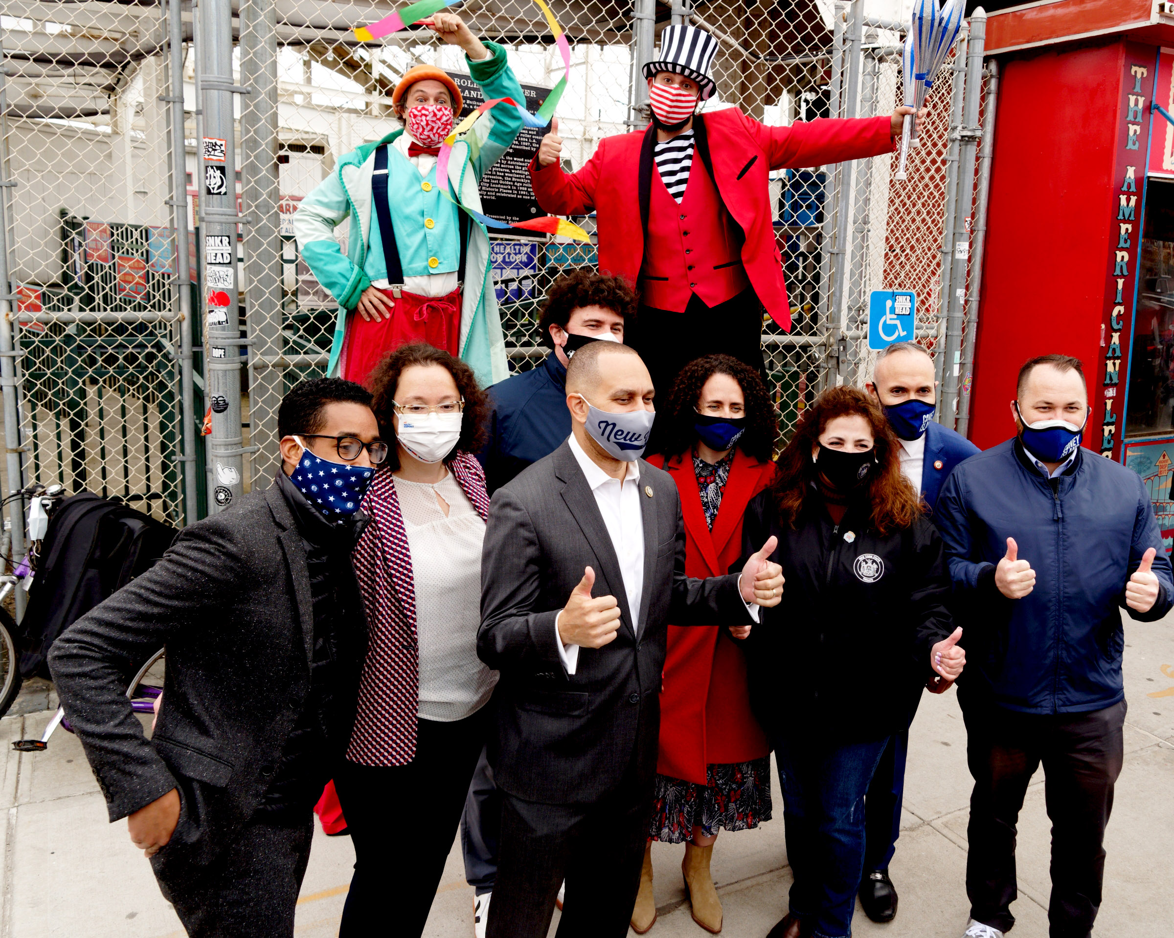 Svetlana Lipyanskaya, CEO of NYC Health + Hospitals/Coney Island; Alessandro Zamperla, president and CEO of Central Amusement International Inc.; Alexandra Silversmith Executive Director of the Alliance for Coney Island; New York State Senator Diane Savino, U.S. Congressman Hakeem Jeffries, Speaker of the New York City Council Corey Johnson, Councilmember Antonio Reynoso, and Councilmember Mark Treyger celebrate at the Cyclone.