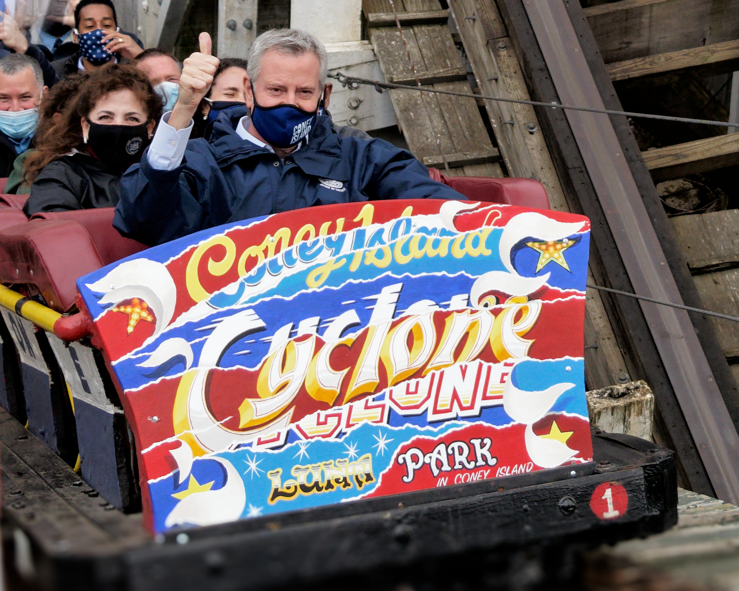 NYC Mayor Bill de Blasio rides the historic Coney Island Cyclone, April 9th, 2021 on “Luna Park Day” at Luna Park in Coney Island.