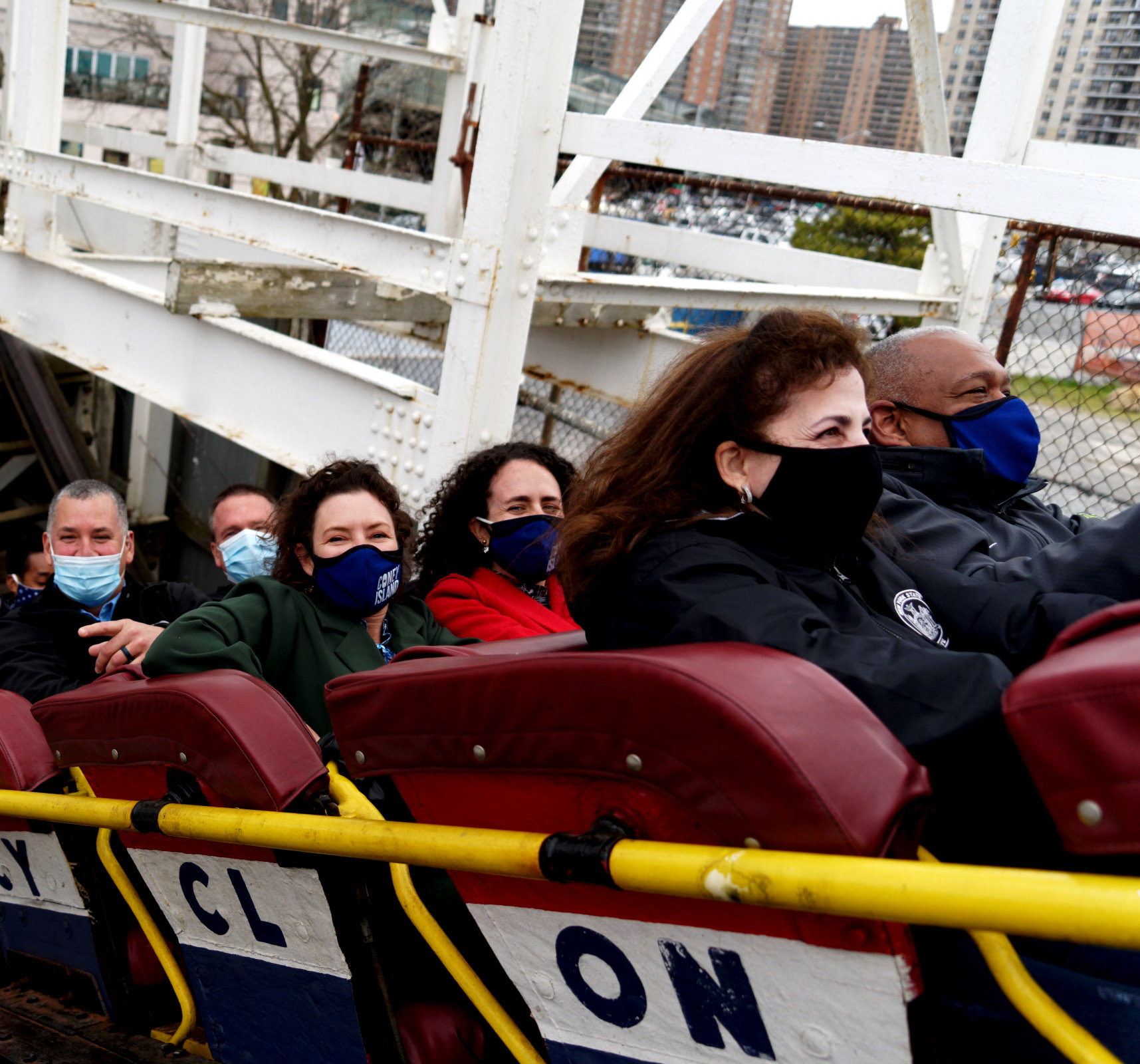 New York State Senator Diane Savino, Department of Parks and Recreation Commissioner Mitchell Silver, and NYCEDC Acting President Rachel Loeb, take the first ride with the NYC Mayor on the Coney Island Cyclone.
